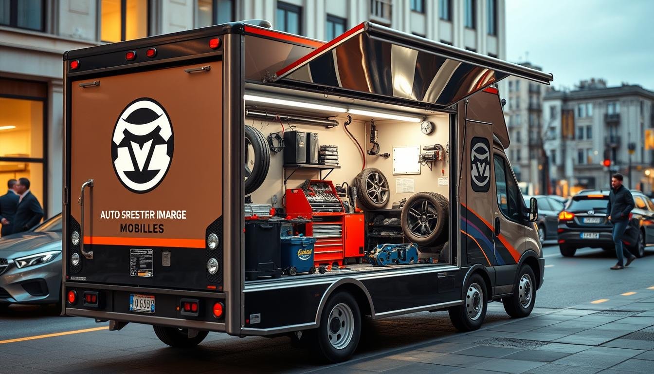 كراج متنقل يقدم خدمات سريعة لتبديل البطاريات والتواير على مدار الساعة.